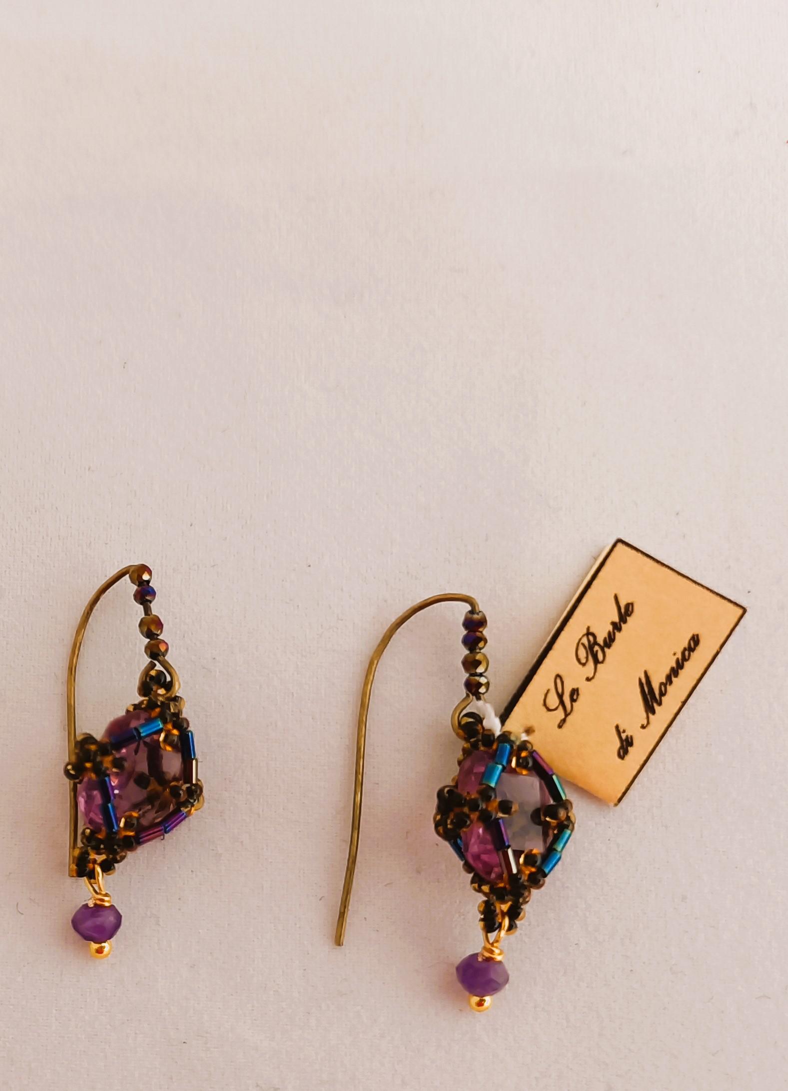Orecchini realizzati interamente a mano con micro perle in vetro di Murano (CONTERIA VENEZIANA) di color verde salvia con piccole baguette verde scarabeo ed impreziositi da un cristallo Vintage di murano di colore viola . Il pendente è realizzato da un cristallo sfaccettato di colore viola . L'amo è impreziosito da quattro perle in ematite iridate. Earrings made entirely by hand with micro pearls in sage green Murano glass (CONTERIA VENEZIANA) with small beetle green baguettes and embellished with a vintage purple Murano crystal. The pendant is made from a faceted purple crystal. The hook is embellished with four iridescent hematite pearls.
